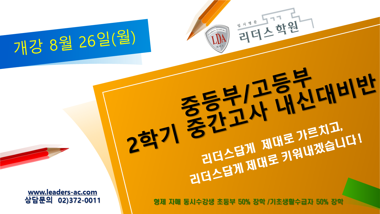중등부 / 고등부 내신대비 개강 8월 26일(월)